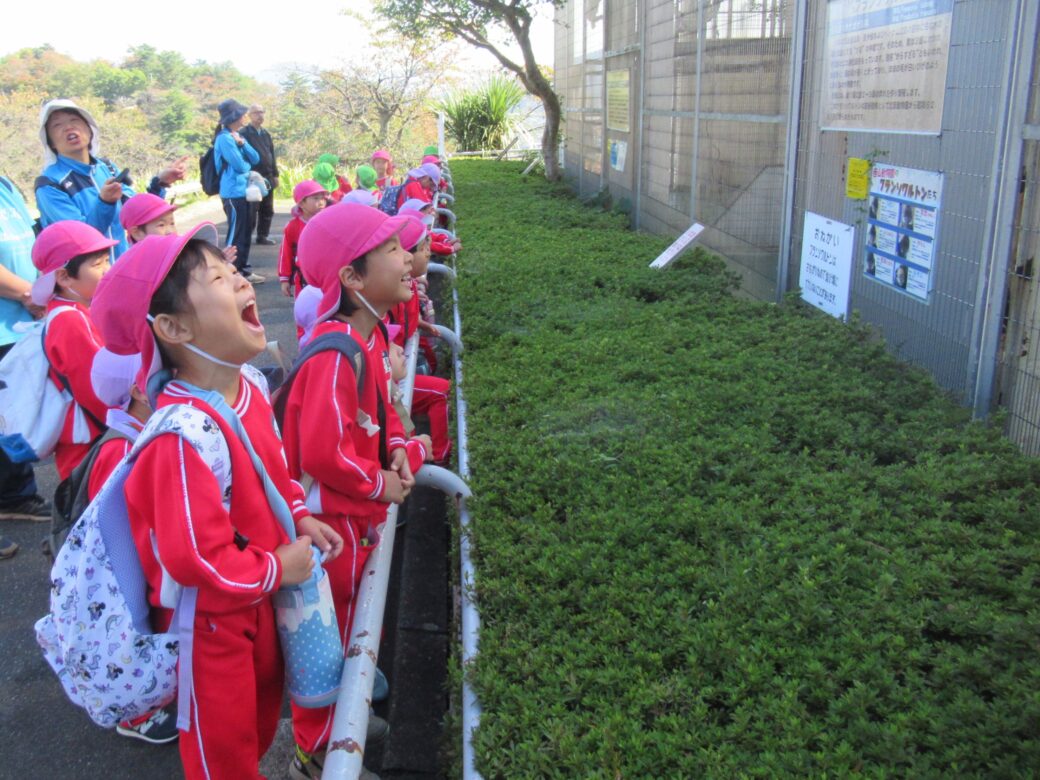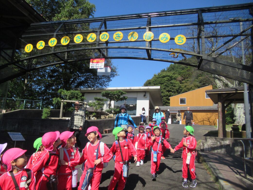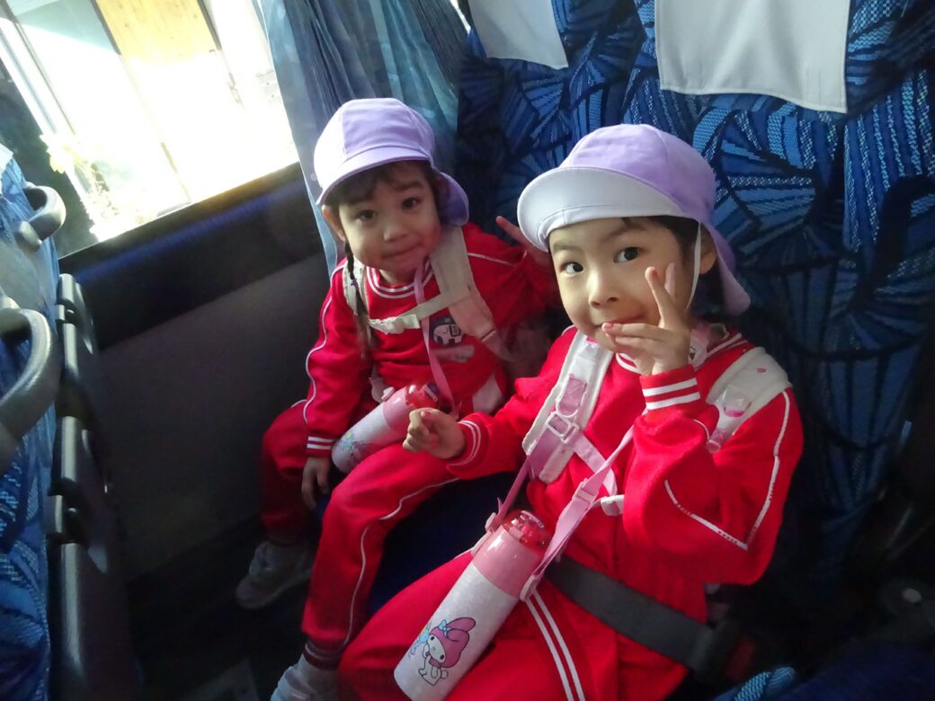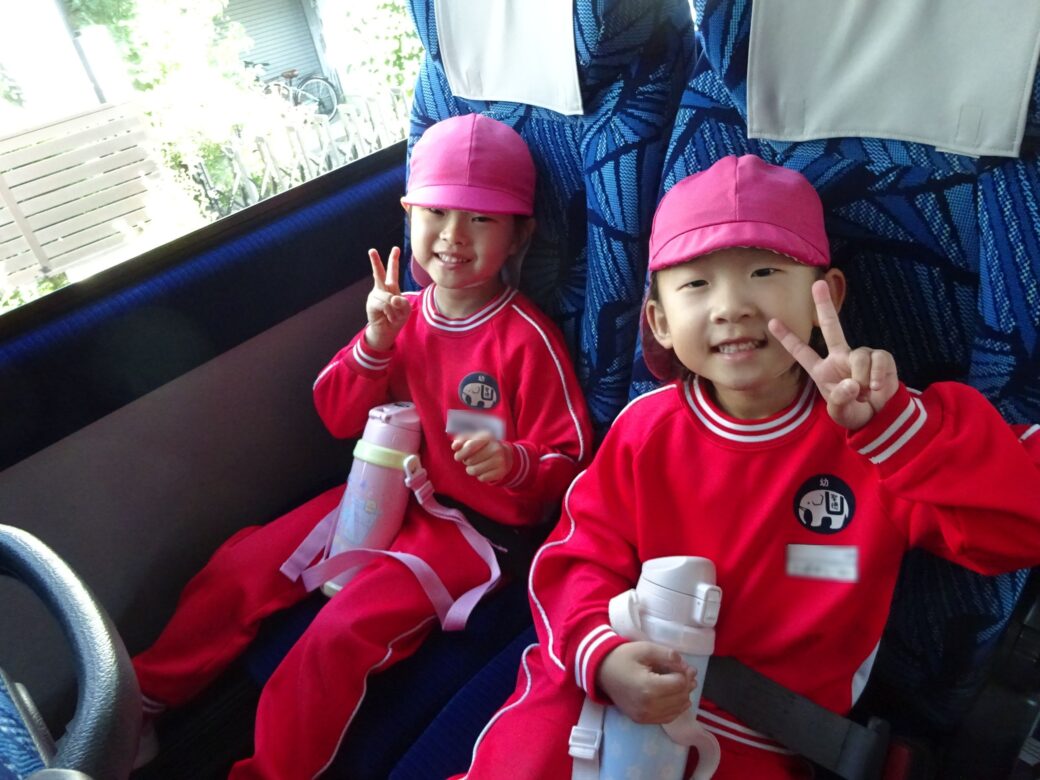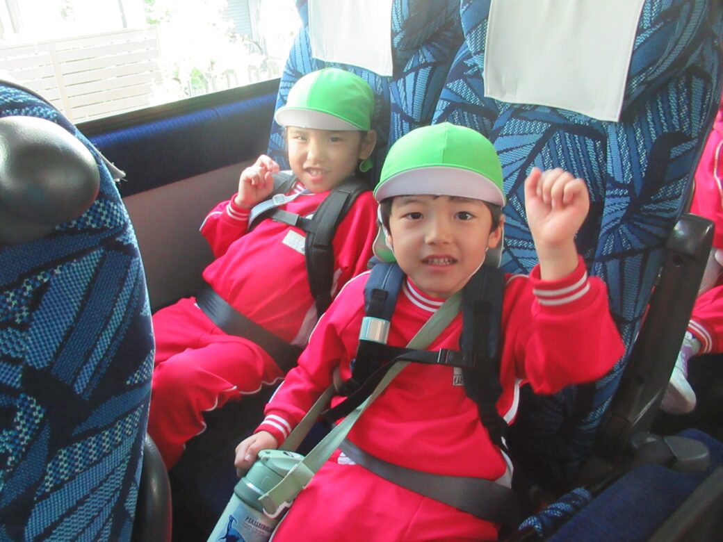 バスの中では、『バスごっこ』『トンボのめがね』『どんぐりころころ』『えんそくはいいな』などの歌をうたったり、景色を見たり、クイズをしたりして楽しく過ごしました。みんなで大型バスに乗っていくことができて、とっても喜んでいた子どもたちです。