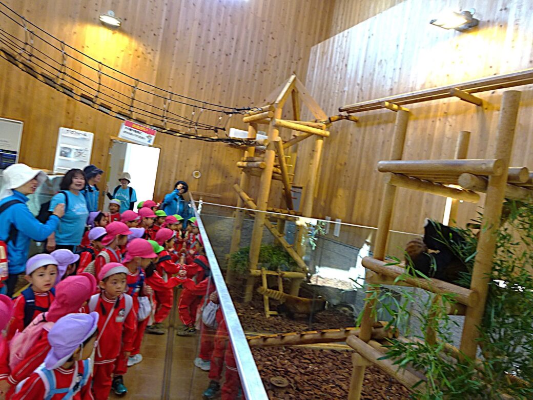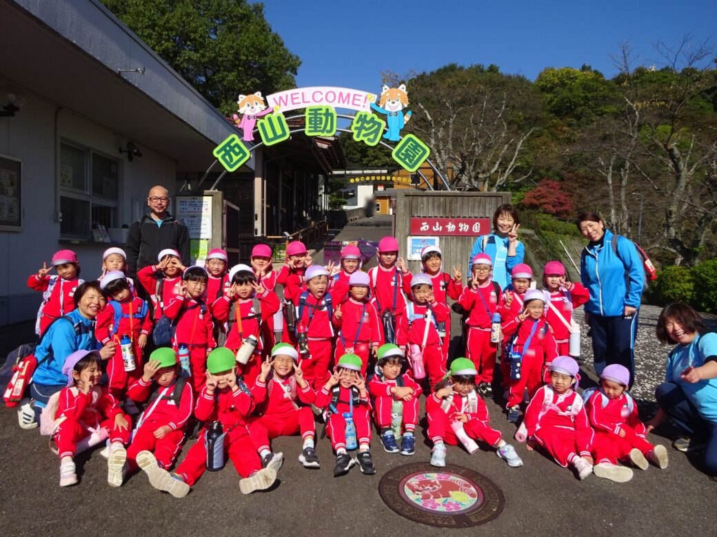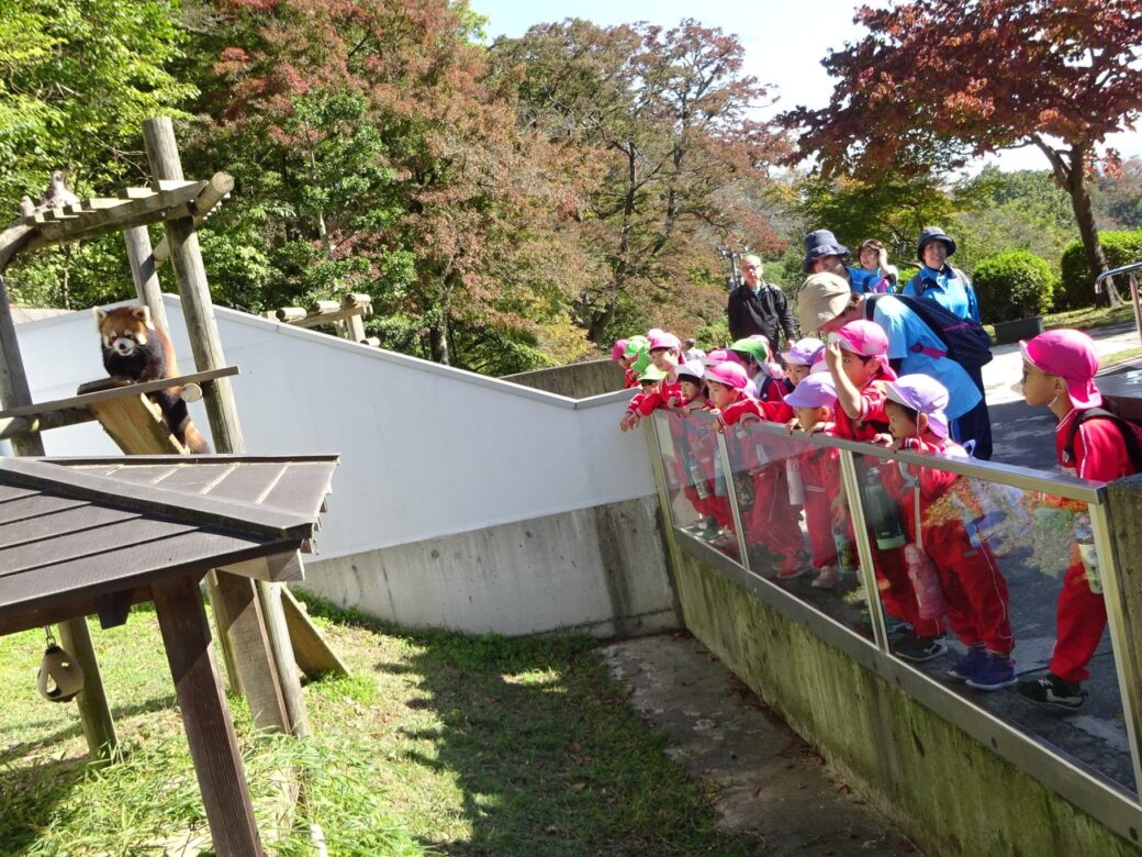 西山公園に着いたら、動物園までの坂道を頑張って登って、みんなで写真を撮ったら、まずはレッサーパンダを見に行きました。レッサーパンダが見えると、「あ、いたー!」「かわいい💕」「木の上登ってる~」「高いとこから落ちないのかな?」と、大興奮で見ていましたよ😆