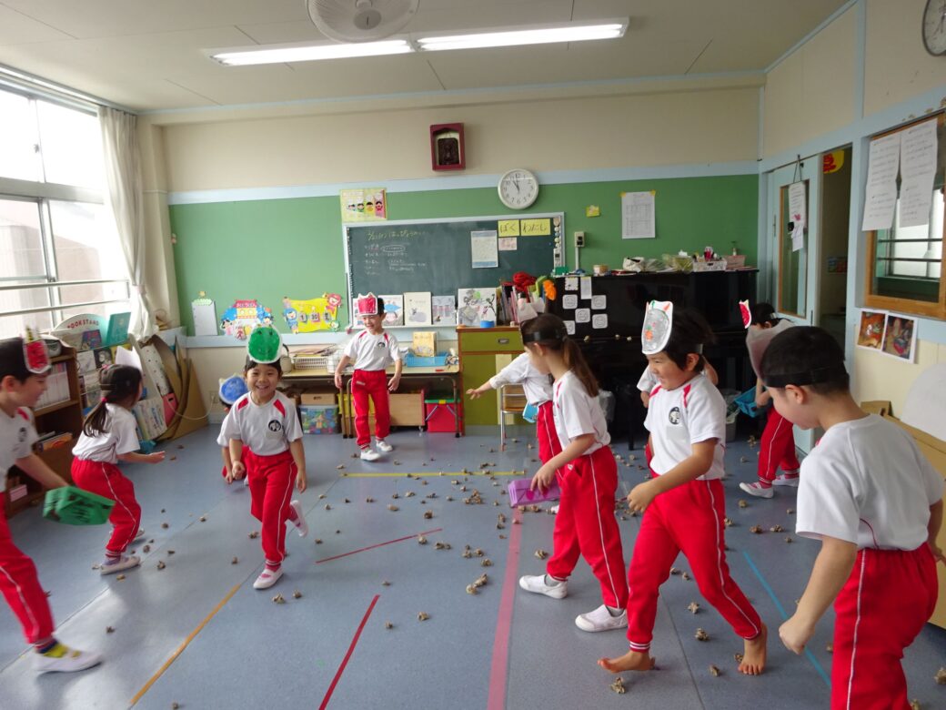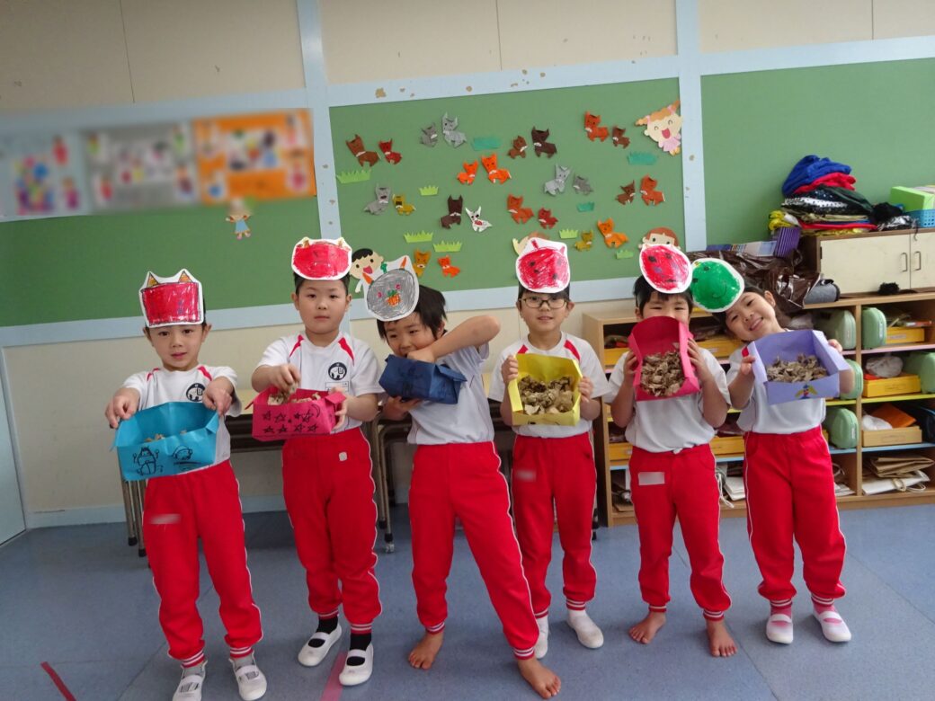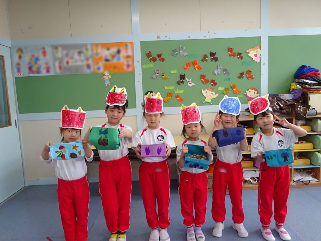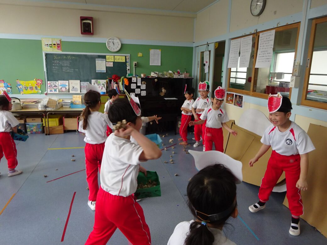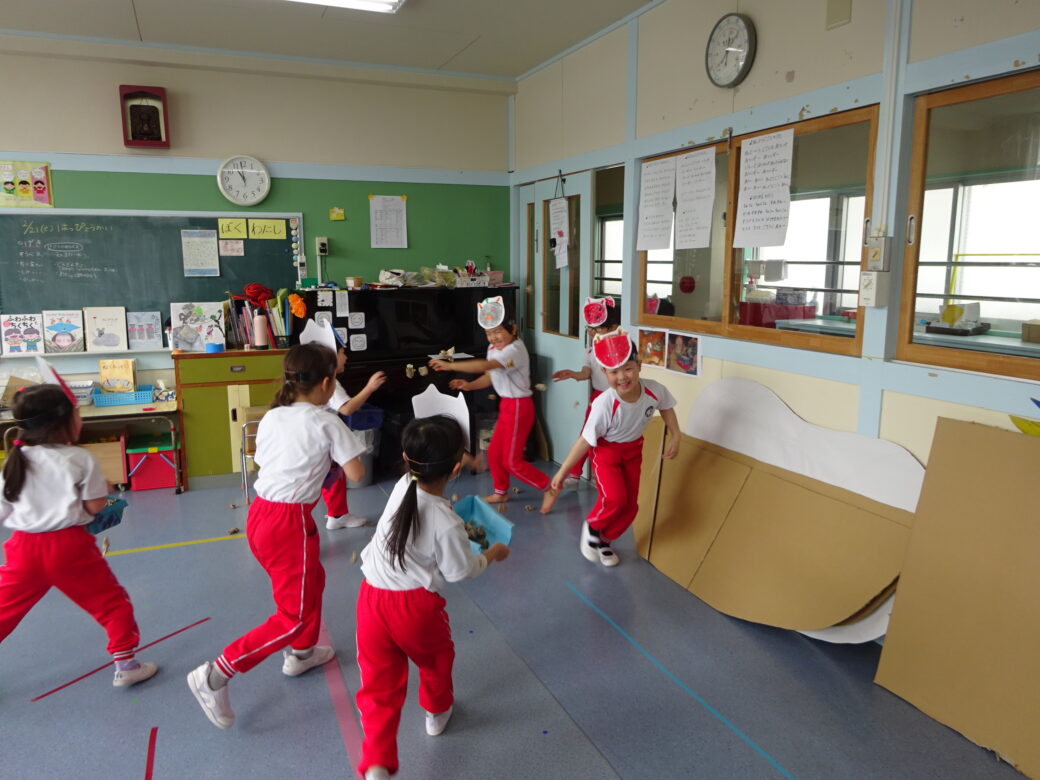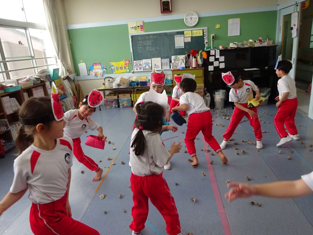 「おこりんぼ鬼がきたぞー!」「なきむし鬼、出ていけー!」「すききらい鬼も出ていけ-!」「おにはそと!!」と、しっかりと豆(紙で作ったお豆です😊)をぶつけてもらっていました🎵