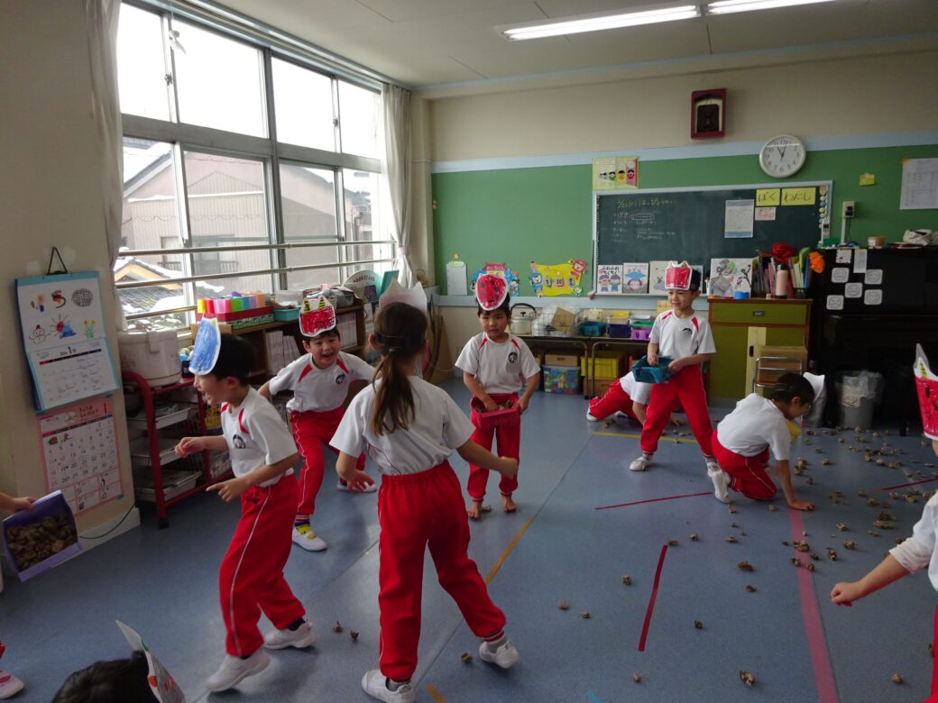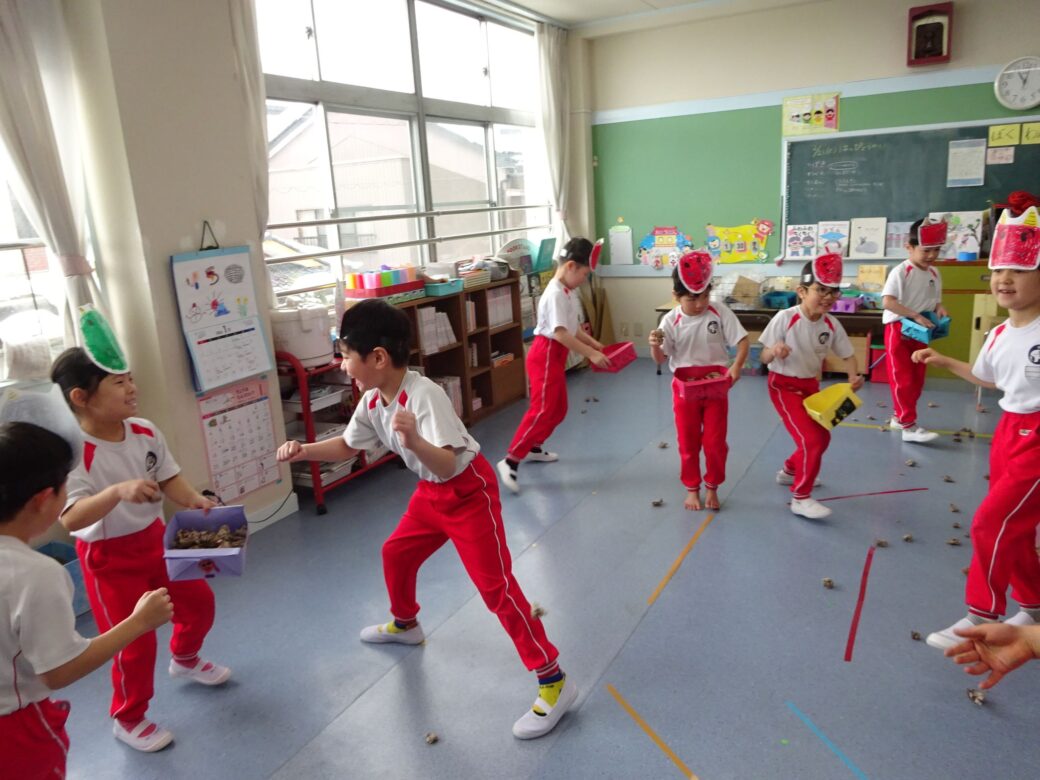 そして今日、みんなで豆まきごっこをしましたよ![]()
