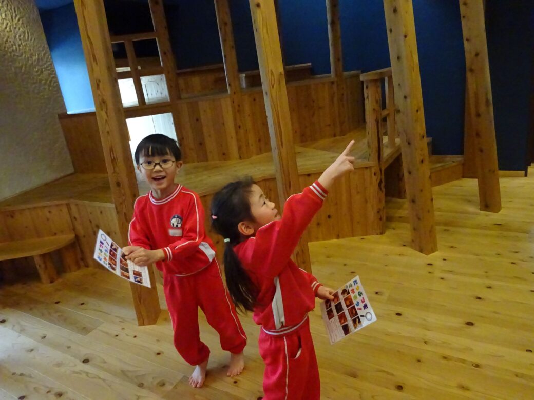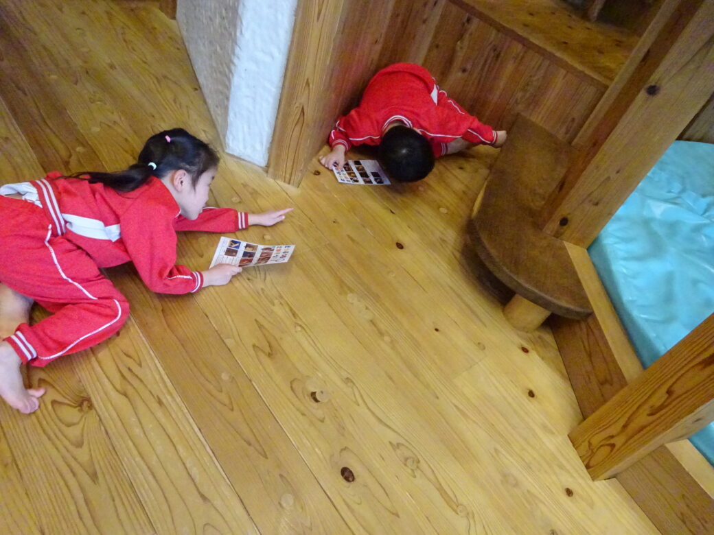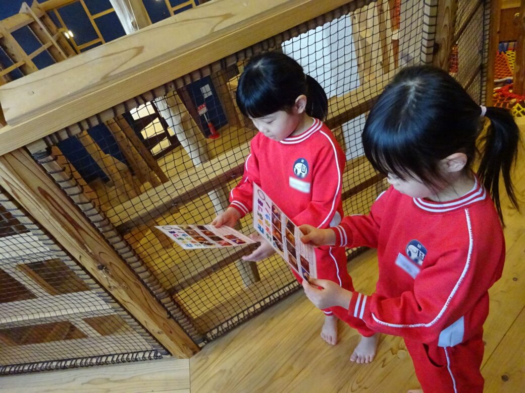 「あっ!ナマケモノいるー!」「ウサギってどこ~?」「えっ!あっちにいたよ、一緒に探そう!」「あんなところにウマいたわ!」「先生、見つけても内緒にしてよ~」と、お友達と教え合ったり協力したりしながら楽しそうに探していました。全部見つけるとごほうびのシールがもらえて、とても嬉しそうでしたよ![]()