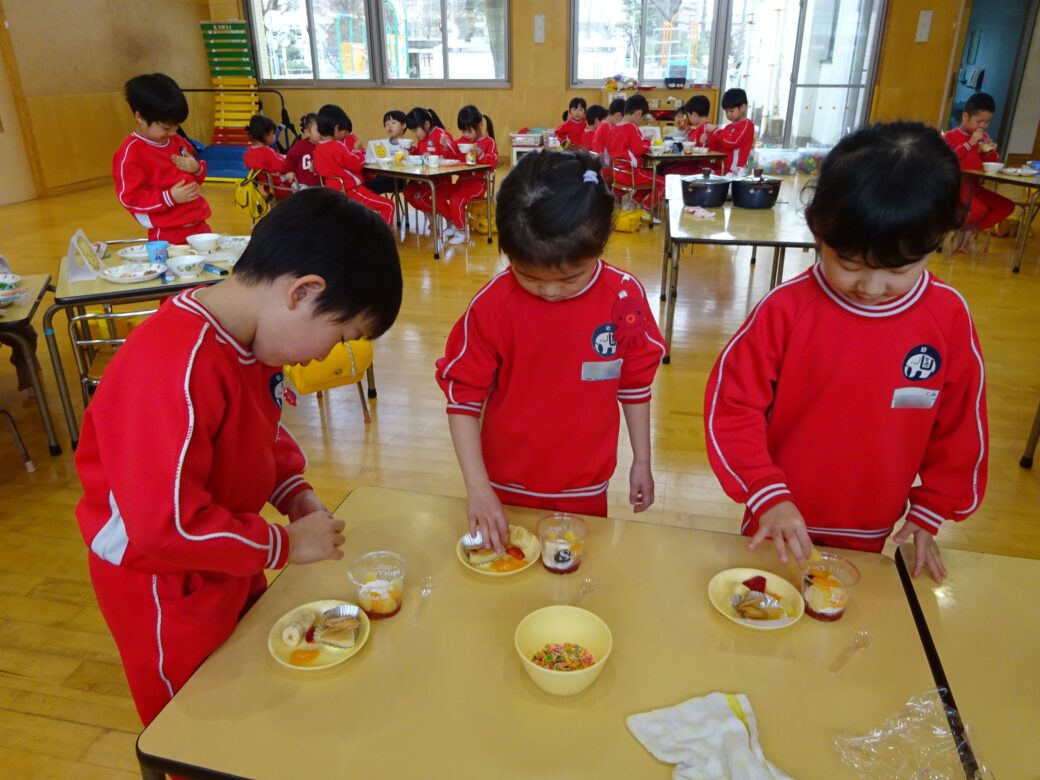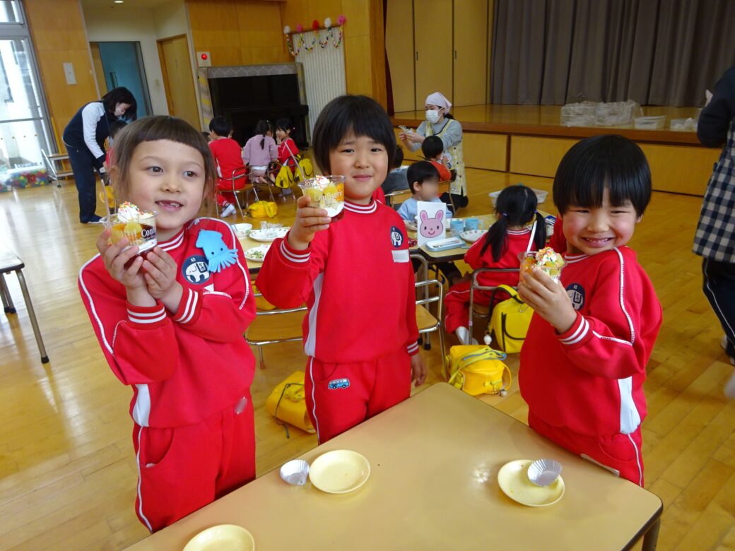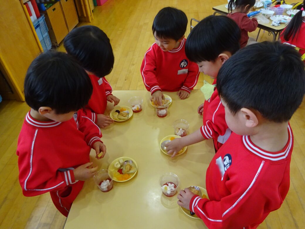 いちごゼリーを入れたカップにフルーツやクリーム、チョコスプレー、そしてビスケットやホットケーキを乗せて、自分だけのパフェを嬉しそうに作っていましたよ![]()