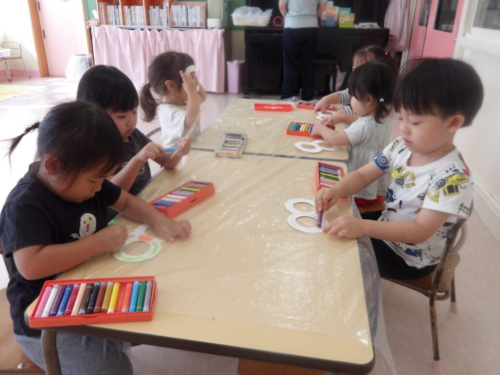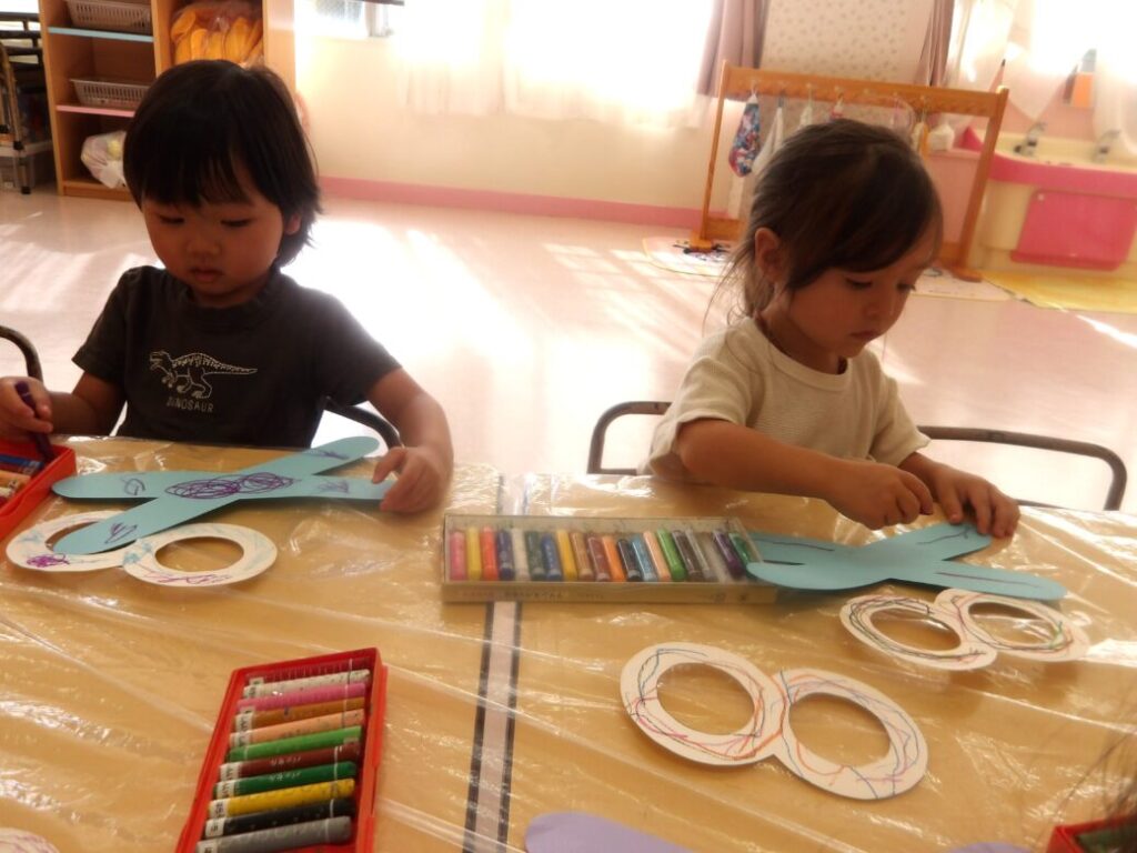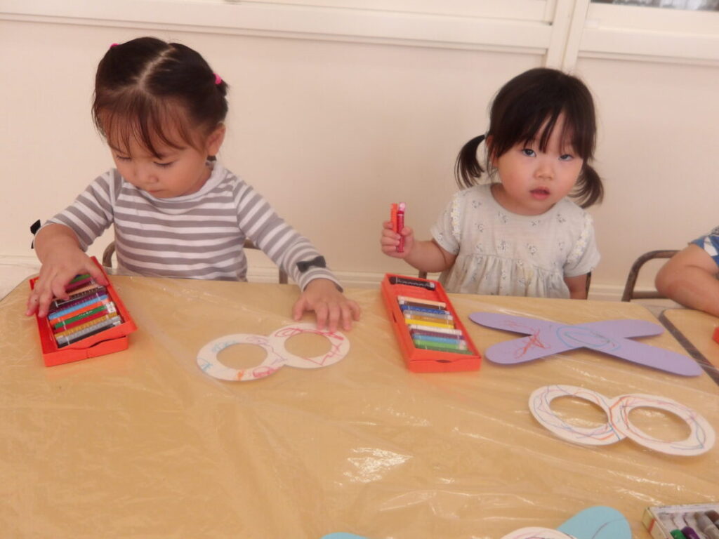 クレヨンで、めがねと羽の形の紙に、線を描いたり色を塗ったりしました。色を重ねて塗ったり、逆に線が重ならないように描いたりと、考えながら描いているようでした。