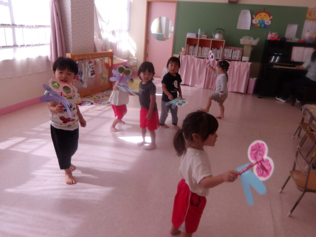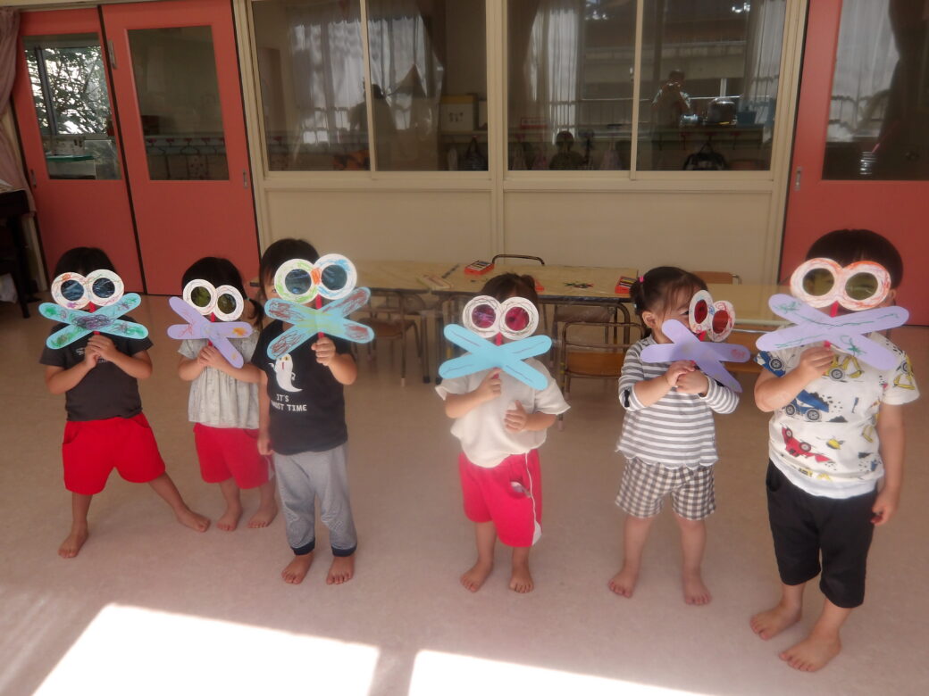 とんぼのめがねの歌が好きなひよこ組さん。お部屋でも「♪とんぼのめがねはピカピカめがね~」と歌っていますよ。子どもたちに何色のめがねがいいか聞くと、「赤いめがねがいい!」「ぴかぴか~✨」と、目をキラキラさせていました。そこで、今日はとんぼを作ってみましたよ。