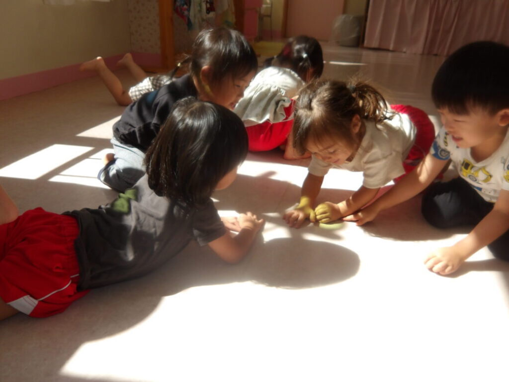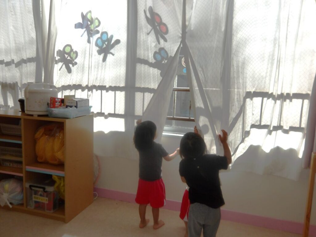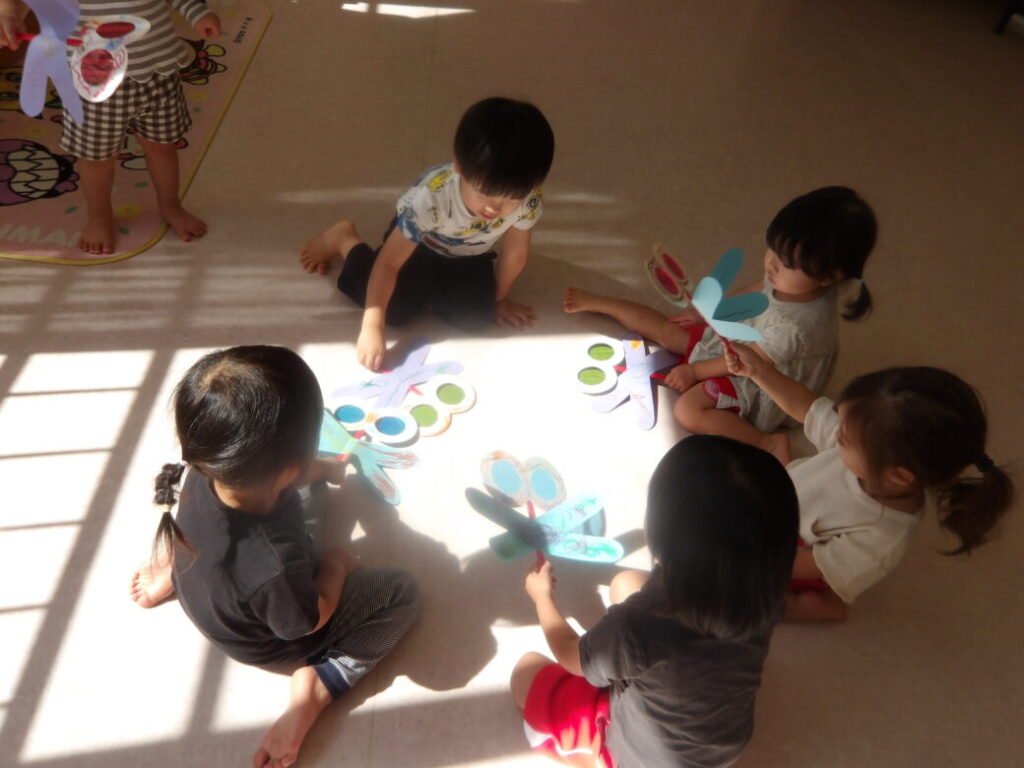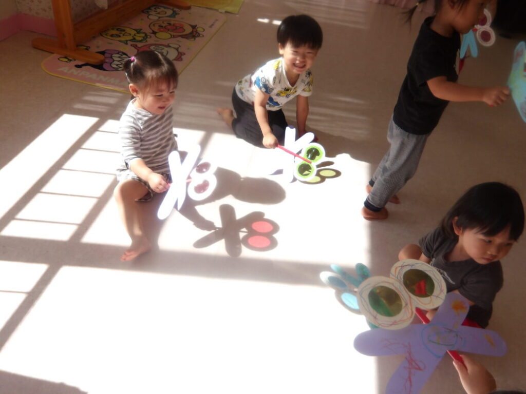 お日さまの光が当たって、セロハンの色が床やカーテンに映るのを見つけては、「あ、とんぼだ!」「つかまえた~」と手で触ったりして楽しんでいました。