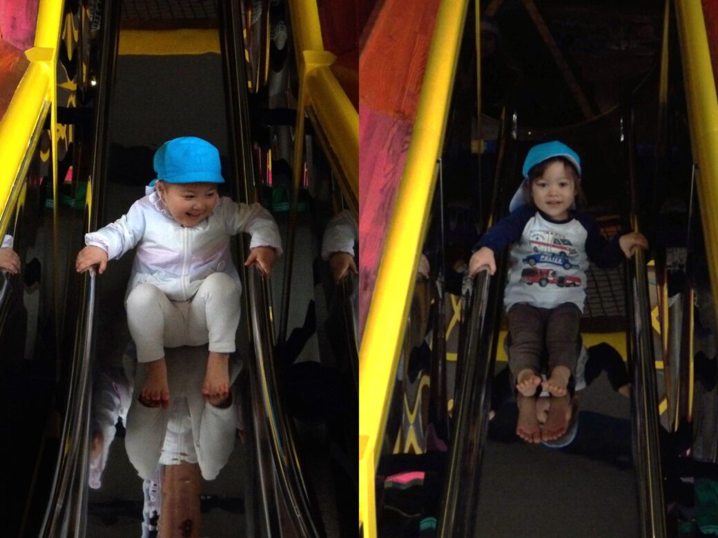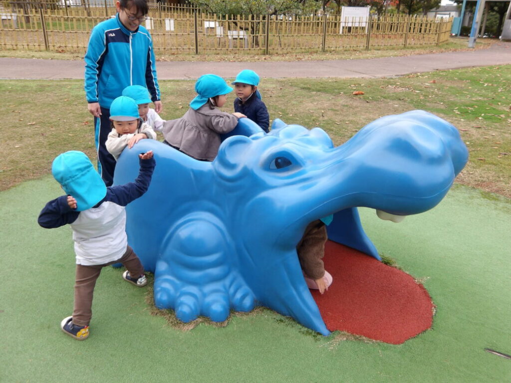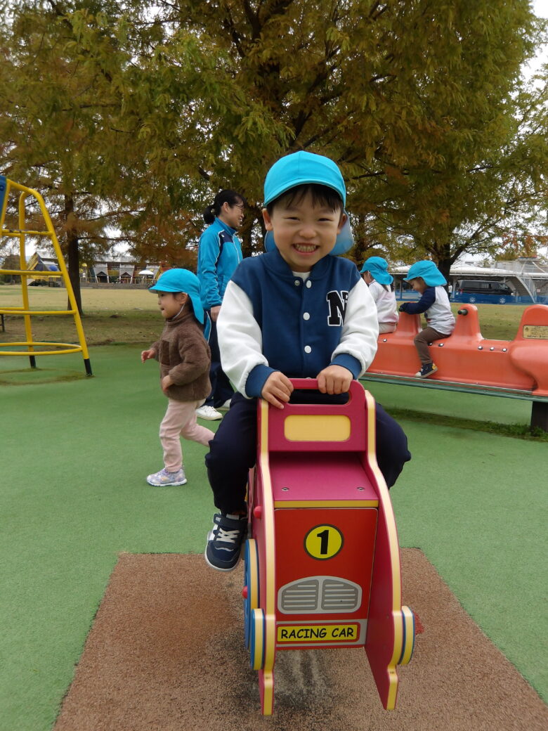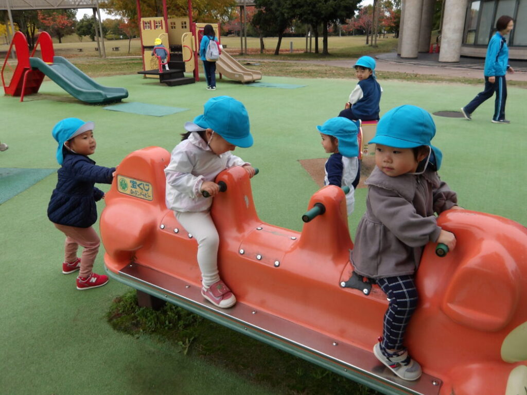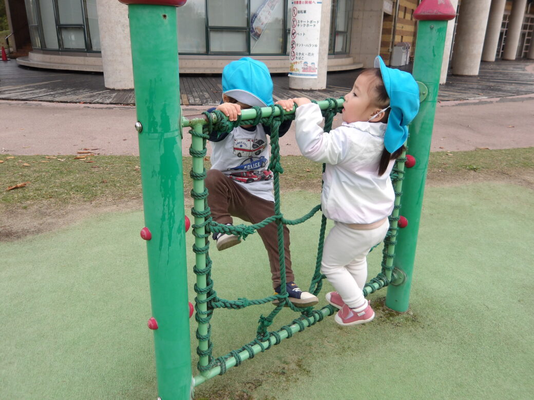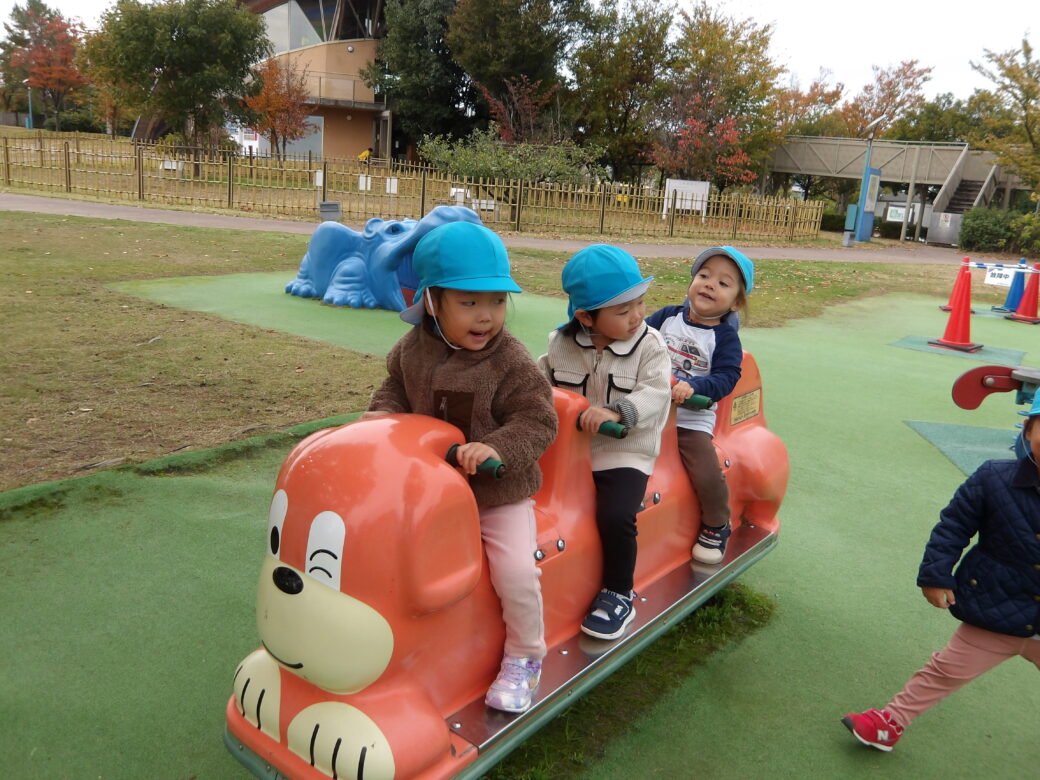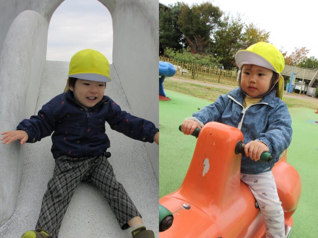 「やっほー♪」といろんな滑り台に登ってシューっと滑ったり、スプリング遊具に仲良く乗ったりして、ニコニコと楽しんでいました![]()
