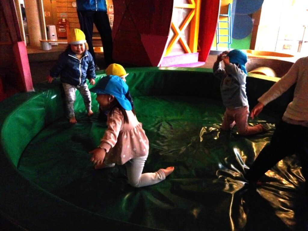 また、ふかふかのマットのところでは、「せーのっ」と言って、ピョンと飛び込んで、気持ちよさそうにゴロゴロして遊んでいました![]()