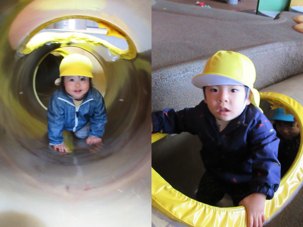 恐竜の足跡の穴に入って、トンネルをくぐったり、はしごやネットを登って、恐竜の中のアスレチックネットを楽しんだり、滑り台をしたりといろんなところに行って、屋内でも楽しんでいましたよ![]()