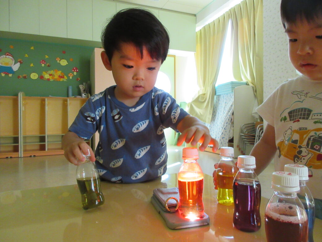 できた色水を今度は、太陽の光や携帯のライトに当ててみたりしてみました